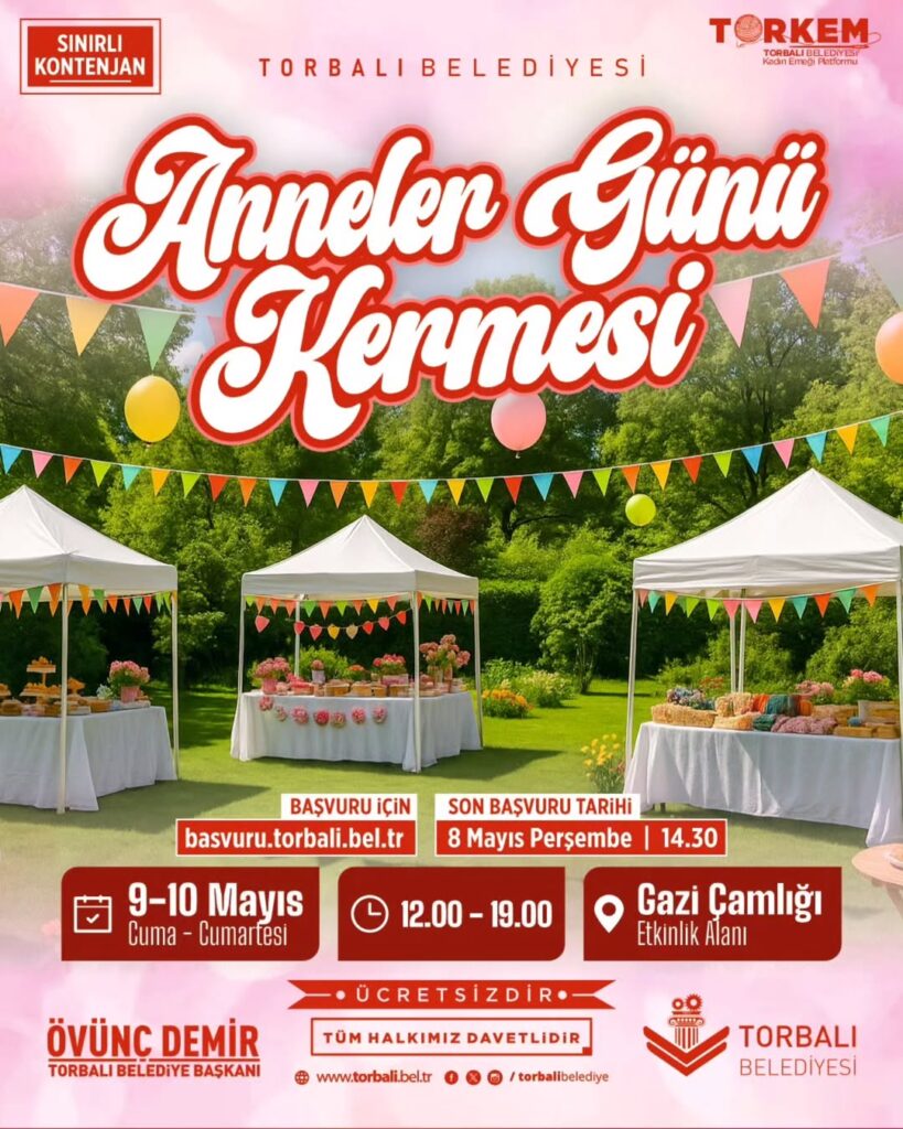Torbalı Belediyesi, katılım için başvuruları 8 Mayıs Perşembe gününe kadar kabul edecek. Kermeste yer almak isteyenler başvurularını kolayca internet üzerinden yapacak. Katılımcılar, kayıt işlemlerini basvuru.torbali.bel.tr adresinden gerçekleştirecek. Başvurular ücretsizdir. Ancak sınırlı kontenjan nedeniyle erken kayıt önem taşıyor.