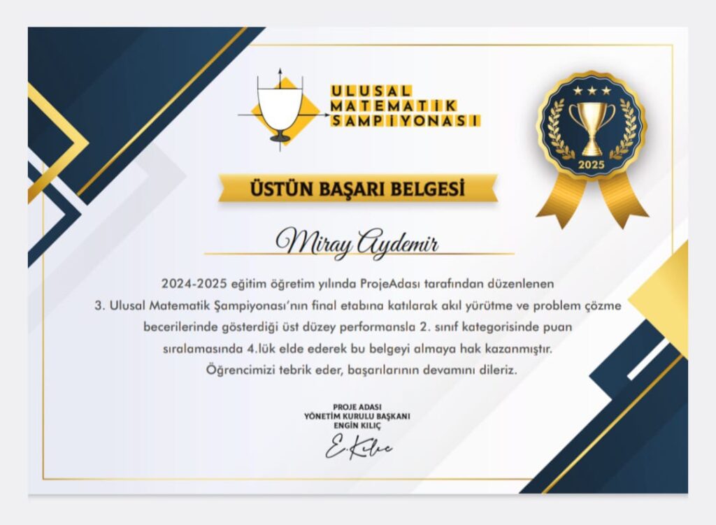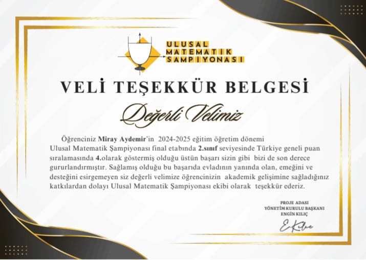 Mayıs ayında gerçekleşen final etabını da başarıyla tamamlayan Miray, Türkiye 4.’sü oldu. Bu başarısı, hem okulunun hem de ailesinin büyük gururu oldu. Ayrancılar Ege Koop İlkokulu adını uluslararası alanda duyuran Miray, zeka ve yetenekleriyle daha pek çok başarıya imza atacağına dair güçlü bir izlenim bırakmıştır.
