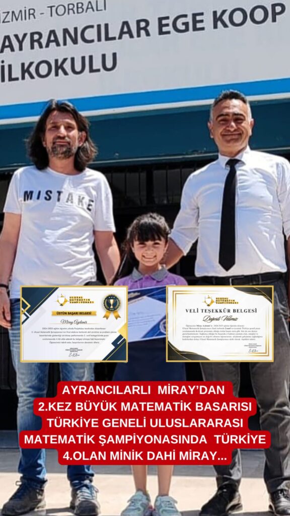 Miray, Türkiye genelinde düzenlenen uluslararası matematik şampiyonasında final etabını büyük bir başarıyla geçti. Ayrıca Ayrancılar Ege Koop İlkokulu gururu olan minik zeka, şampiyonada Türkiye 4.’sü olarak dikkatleri üzerine çekti. Şampiyonanın iki aşamalı sınavında, Mart ayında yapılan 1. etapta büyük bir dereceyle başarılı olan Miray, Aydın’da yapılacak final sınavına katılmaya hak kazanmıştı.