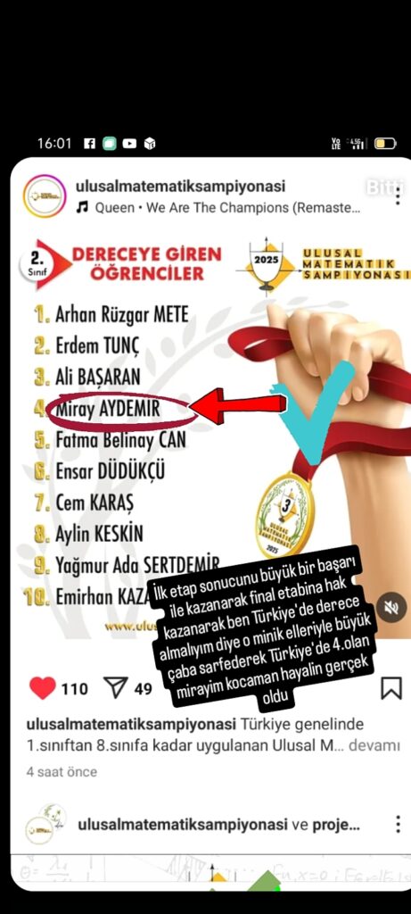 Miray, bu başarıyı azmi, düzenli çalışması ve matematikle olan güçlü ilgisine borçlu. Bu yüzden Öğretmenlerinin rehberliğinde, her gün düzenli olarak çalışarak matematiksel düşünme becerisini geliştirdi. “Başarı, çok çalışmanın sonucudur” diyerek, hem öğretmenlerine hem de arkadaşlarına ilham vermektedir.