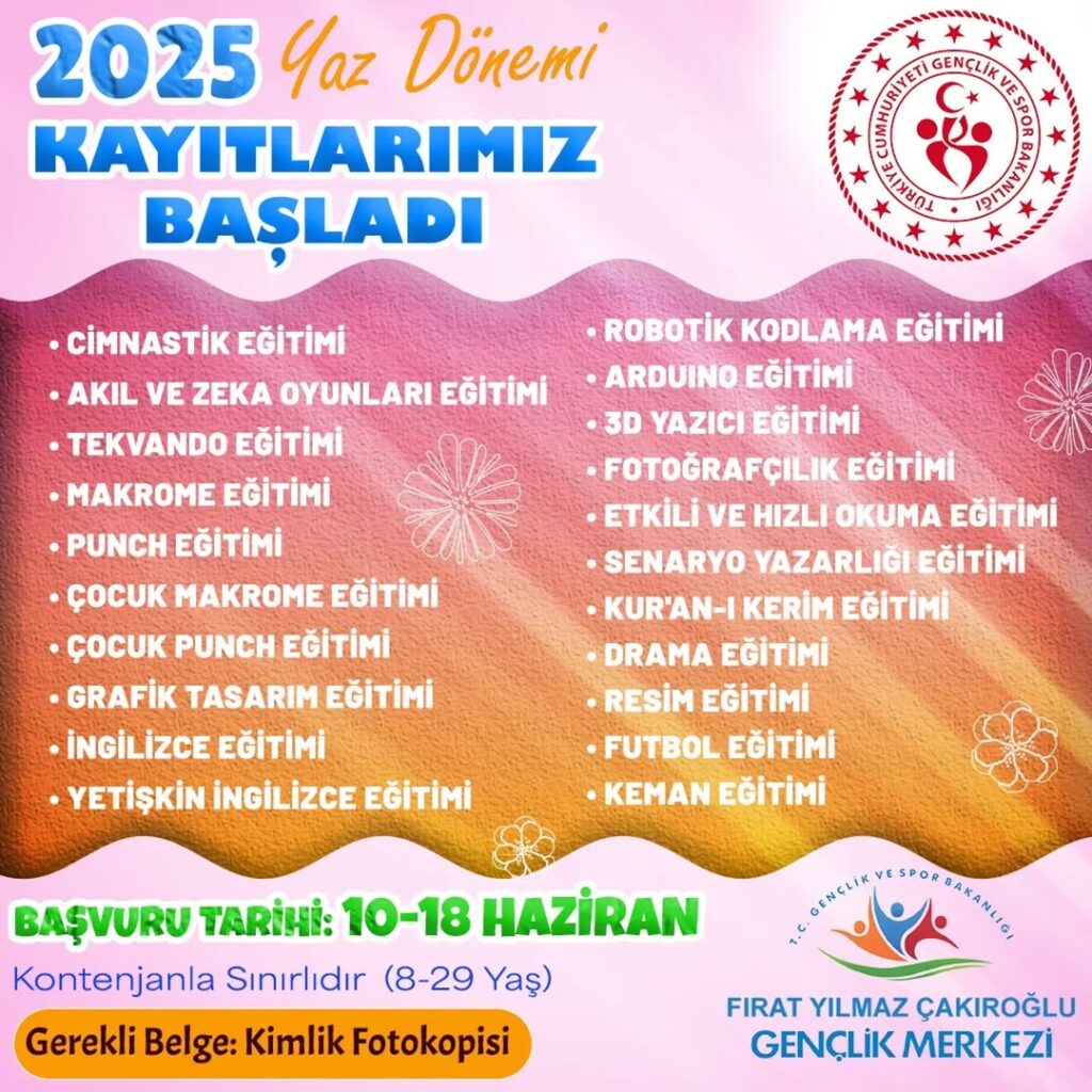 Kayıtlar, 10-18 Haziran tarihleri arasında alınıyor. 8-29 yaş aralığındaki herkes başvuru yapabiliyor. Başvuru için sadece kimlik fotokopisi gerekiyor. Ancak kontenjanlar sınırlı olduğu için erken kayıt yaptırmak büyük avantaj sağlıyor. Ayrancılar Fırat Yılmaz Çakıroğlu Gençlik Merkezi, bölgedeki gençlerin yaz aylarını verimli geçirmesini sağlayacak.