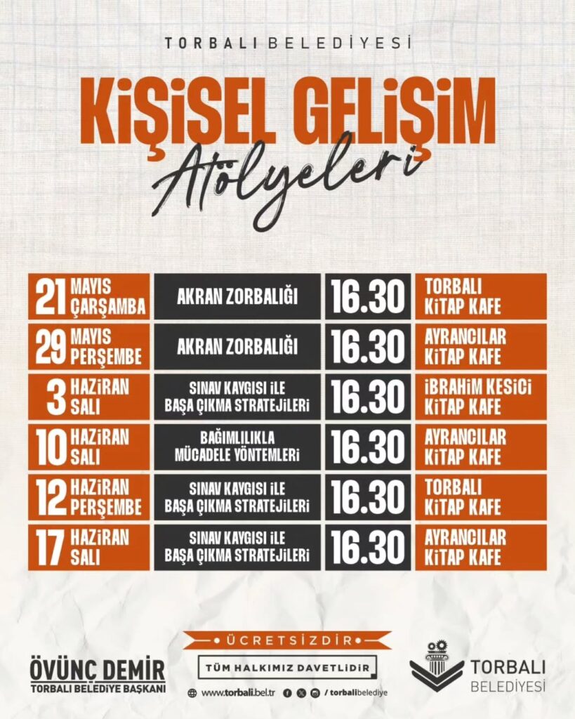 Torbalı Belediyesi, bu kişisel gelişim atölyelerini ücretsiz olarak veriyor. Ayrancılar Kitap Kafe’deki bu etkinlikler, tüm halkımızın katılımına açık. Her yaştan katılımcı, bu atölyelere katılarak kendi kişisel gelişimlerini destekleyebilir. Atölyeler, sadece gençlere yönelik olmayıp, herkesin faydalanabileceği içeriklere sahiptir. Kişisel gelişim, yaşam boyu süren bir süreçtir.