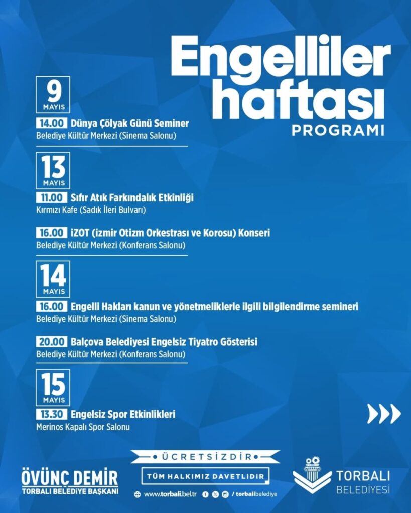 Ayrıca tüm programlar ücretsiz olarak gerçekleşecek. Torbalı Belediyesi kültür programı, farkındalık temasıyla sosyal bütünleşmeyi teşvik edecek. Dahası Engelliler Haftası boyunca her yaştan vatandaş etkinlik alanlarında bir araya gelerek, güçlü bir toplumsal mesaj verecek.