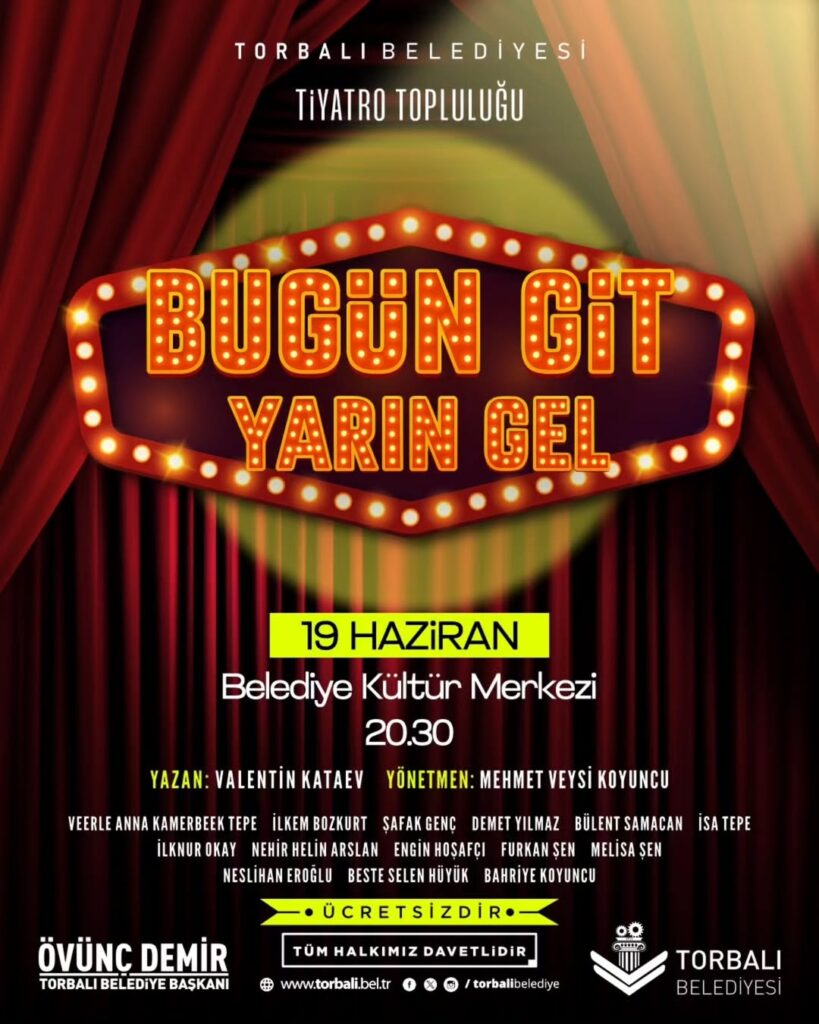Torbalı tiyatro sahnesi, yaz akşamlarını renklendirmeye devam ediyor. Torbalı Belediyesi Tiyatro Topluluğu, izleyicilerini bu kez Valentin Kataev’in yazdığı komedi klasiği “Bugün Git Yarın Gel” ile buluşturuyor. Ayrıca Eğlenceli bir akşam geçirmek isteyen tüm vatandaşlar, 19 Haziran Perşembe günü saat 20.30’da Torbalı Belediye Kültür Merkezi’ne davetli!