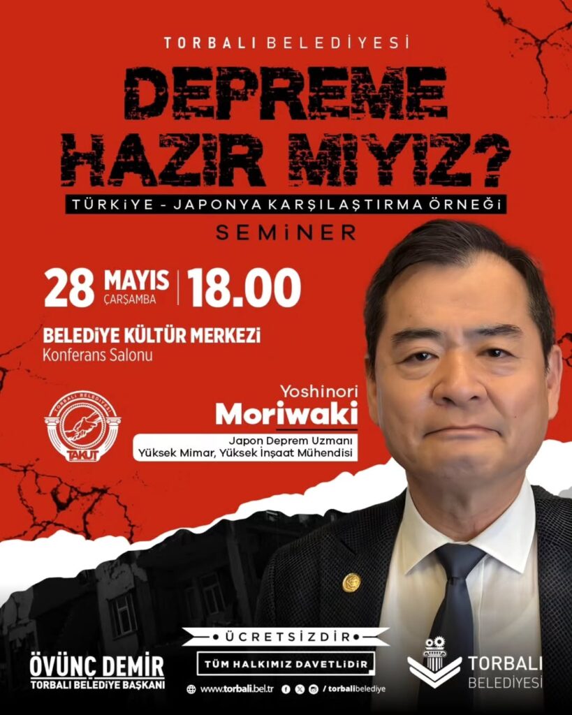 Torbalı, deprem güvenliği konusunda önemli bir etkinliğe ev sahipliği yapacak. 28 Mayıs Çarşamba günü, ünlü Japon Deprem Uzmanı, Yüksek Mimar ve İnşaat Mühendisi Yoshinori Moriwaki, BKM Konferans Salonu‘nda “Depreme Hazır Mıyız? Türkiye-Japonya Karşılaştırma Örneği” konulu bir konuşma yapacak. Etkinlik, Torbalı‘da deprem güvenliği konusunda farkındalık yaratmayı hedefliyor.
